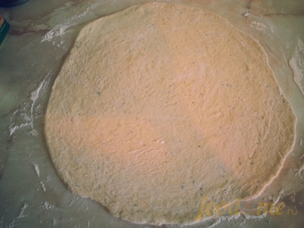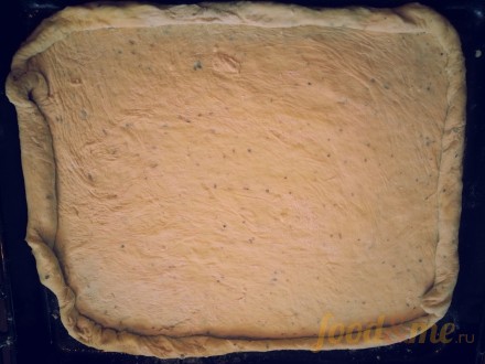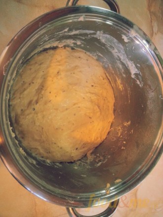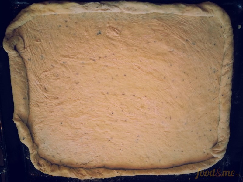 Добавляем в муку 1 чайную ложку сухих дрожжей, 1/2 чайной ложки соли, 2/3 столовых ложки сахара, сухой базилик, столовую ложку оливкового масла, 2/3 стакана холодной воды. Замешиваем тесто. Накрываем пленкой. Ставим на 1 час в теплое место