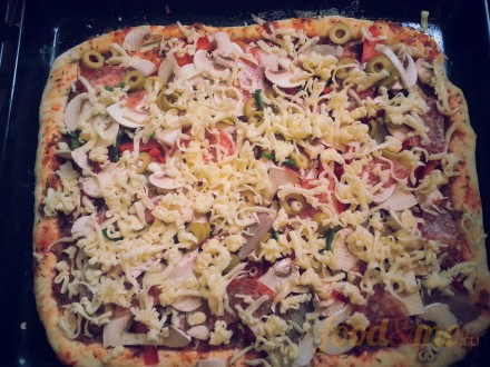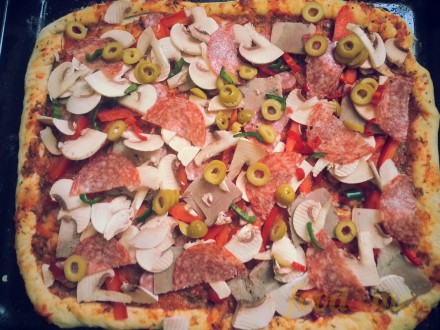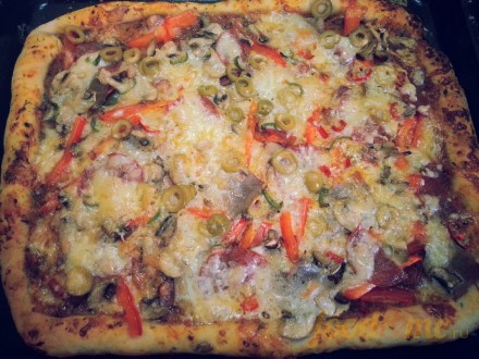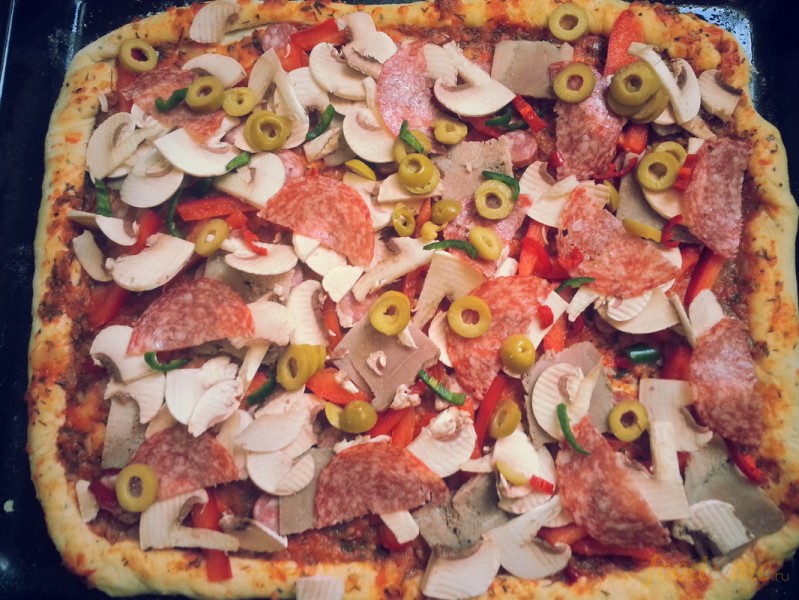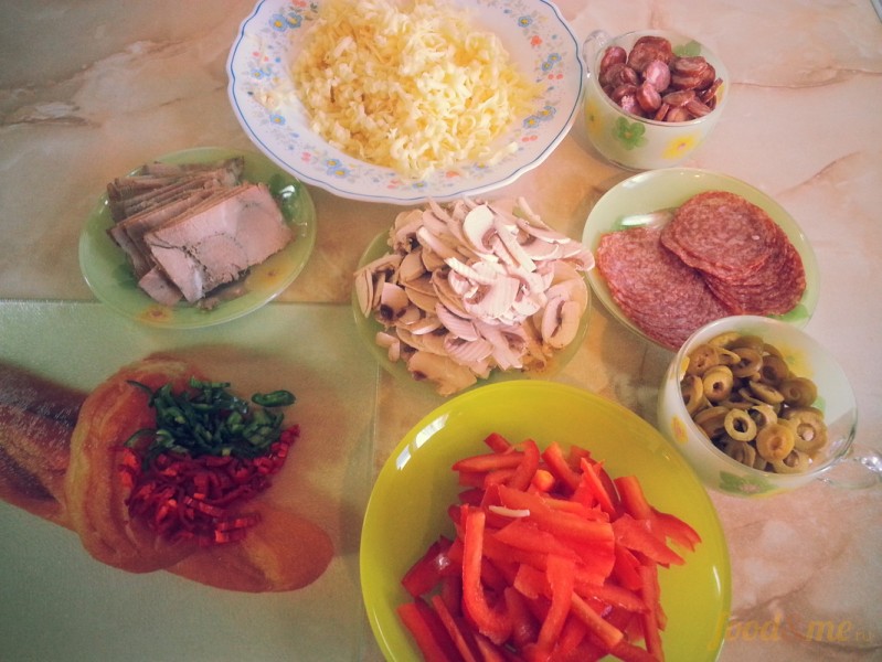 Для начинки можно использовать всё что есть под рукой. Мы брали салями, колбаски, мясо, оливки, грибы, болгарский перец, перец чили, сыр